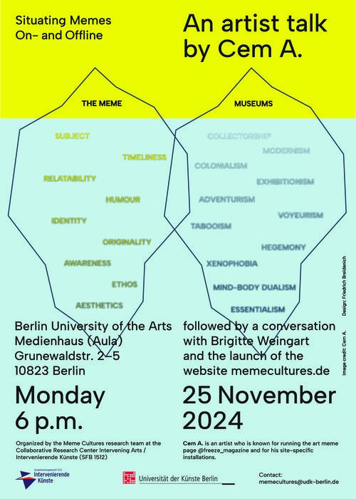 Cem A., known for his Instagram account @freeze_magazine among other things, will talk about his meme production online and offline in an artist talk.